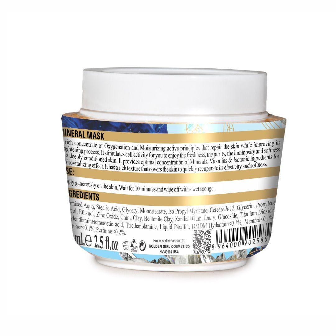 Golden Girl Mineral Mask is a rich concentrate of oxygenating and moisturizing active principles that repair the skin while improving its brightening process. It stimulates cell activity for freshness, purity, luminosity, and softness of a deeply conditioned skin. It provides an optimal concentration of minerals, vitamins, and Isotonic ingredients for the hydro-vitalizing effect. It has a rich texture that covers the skin to quickly recuperate its elasticity and softness.